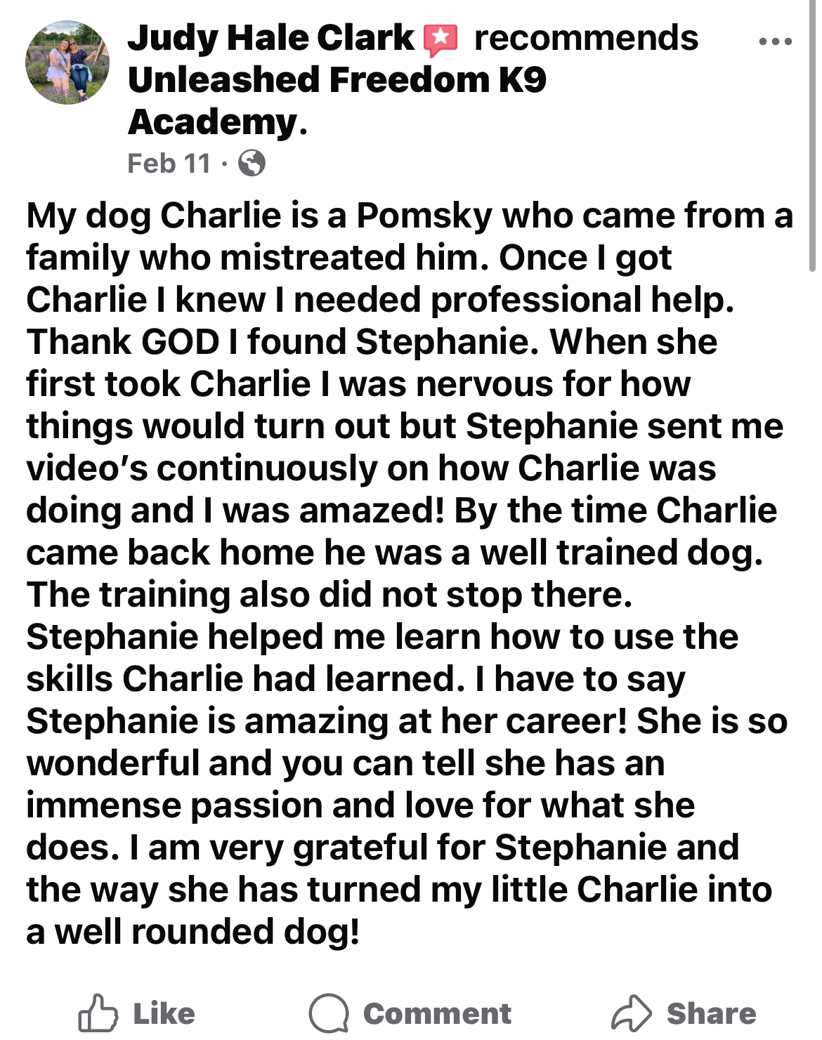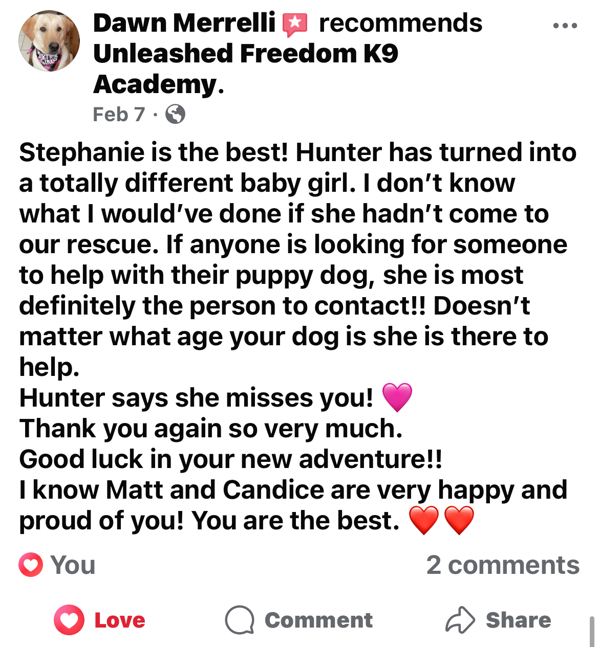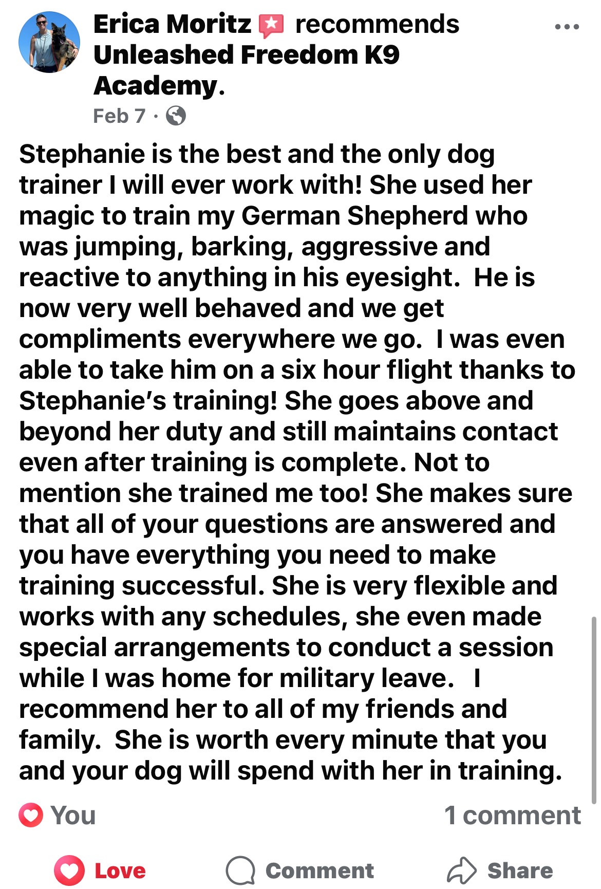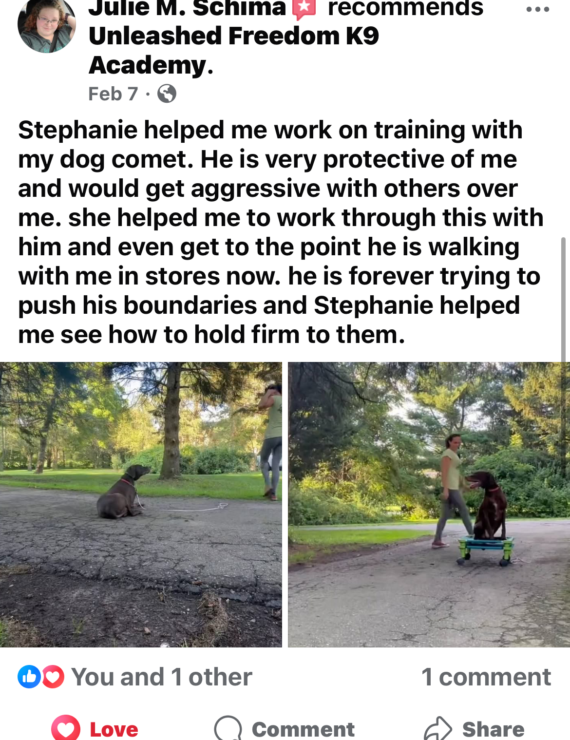 Second, we provide unlimited phone and email support for the life of your dog! This is a part of our Unleashed Freedom K9 Academy's Satisfaction Promise.