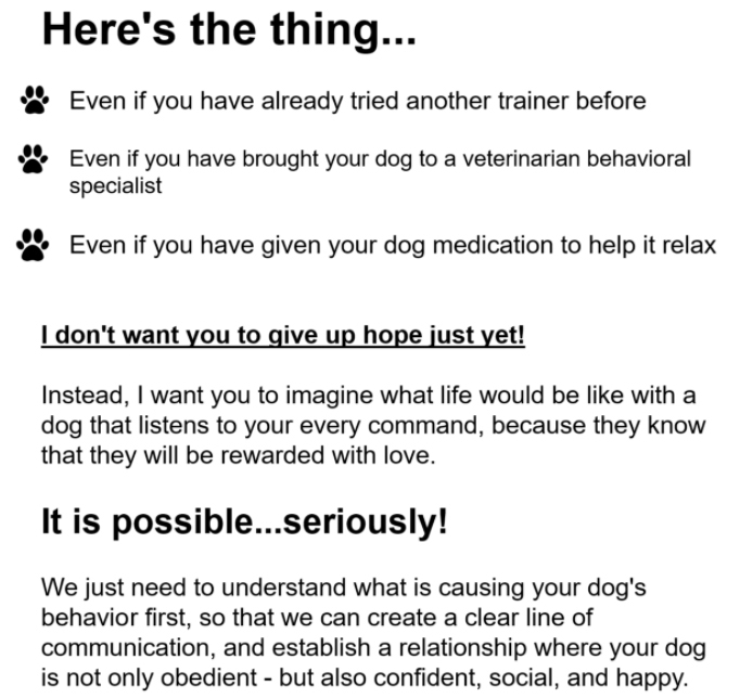We will share our findings of why or what is causing your dog's problematic or unwanted behavior.